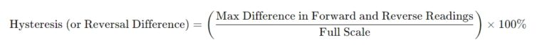 Hysteresis refers to the maximum difference between readings during a rising and falling measurement cycle, under identical conditions. It reflects the instrument’s ability to return the same output for the same input, regardless of direction.