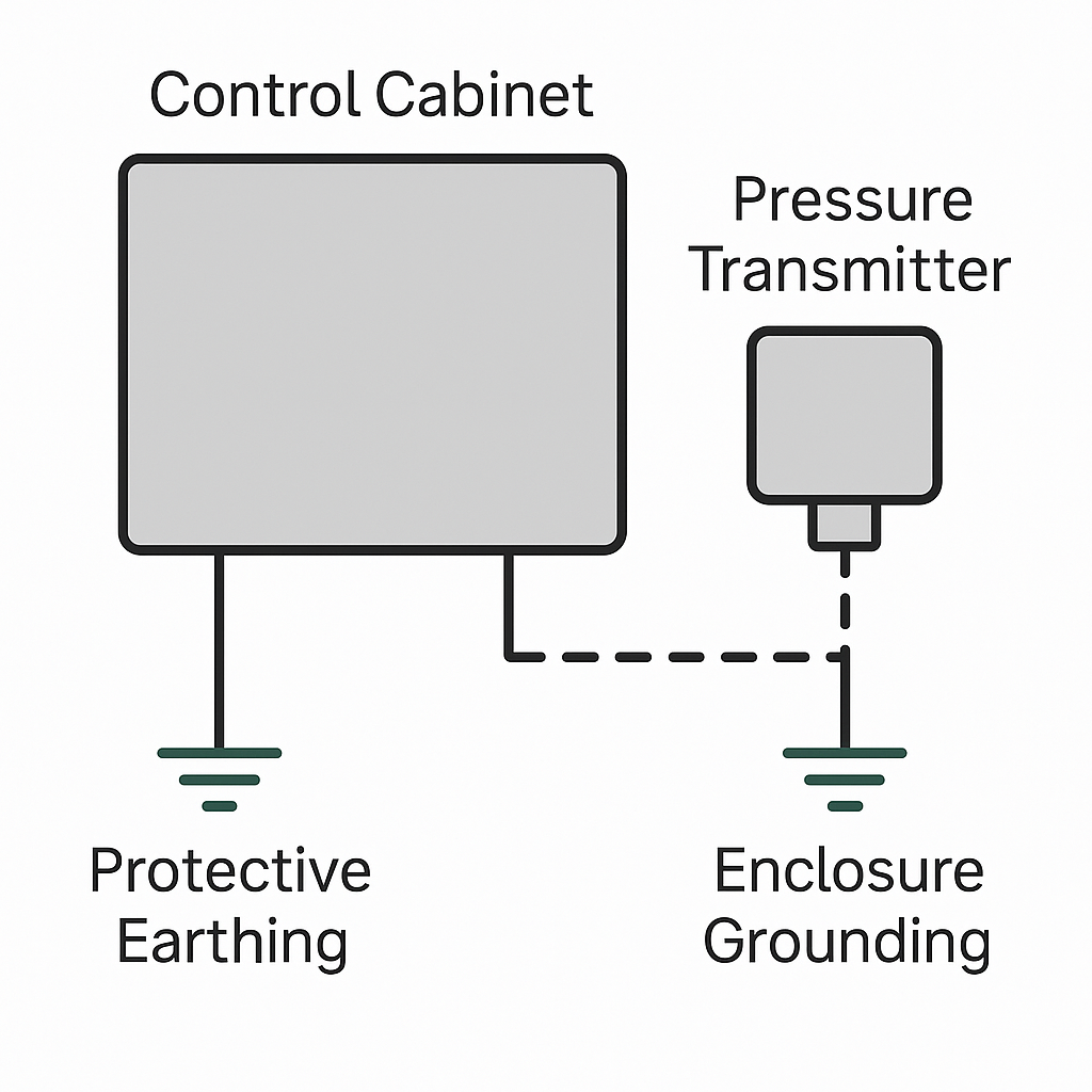 Imagine a control cabinet that houses a pressure transmitter with a 4–20 mA signal output. The transmitter’s metallic body is grounded for EMC reasons (enclosure grounding), while the cabinet itself is connected to the PE system for safety.