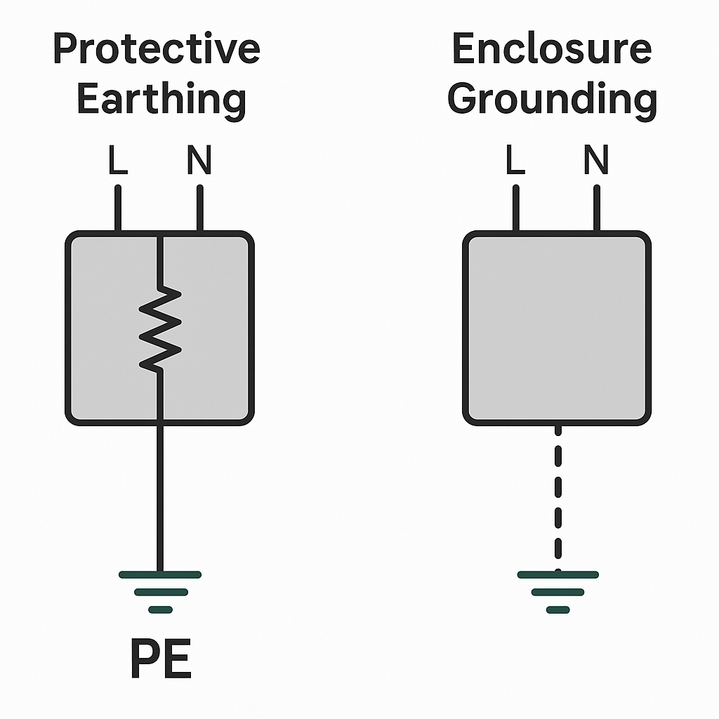 Protective earthing and enclosure grounding serve distinct but sometimes overlapping purposes. While both involve connecting components to ground, only protective earthing is designed to prevent electric shock. Enclosure grounding supports system stability and EMI control, and is a part of good engineering practice but not a replacement for PE.