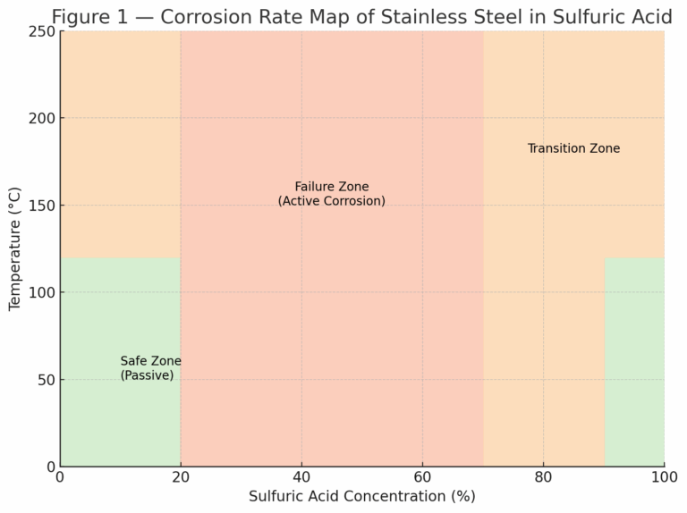 Sulfuric acid exhibits different corrosion characteristics depending on concentration and temperature. These can be classified into three zones: Passive (Safe Zone), Active (Dangerous Zone), and Transition Zone.