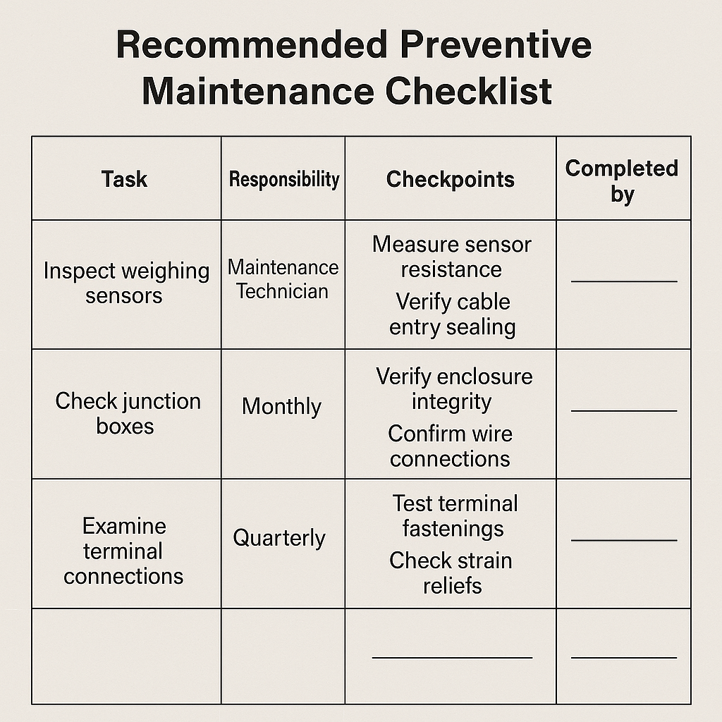 Regular maintenance: Include all weighing sensors, junction boxes, and terminal connections in the preventive maintenance checklist.