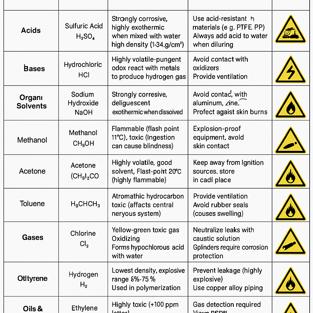 Sulfuric Acid | H₂SO₄ | Strongly corrosive, high density (1.84 g/cm³), highly exothermic when diluted | Use acid-resistant materials (e.g., PP, PTFE, lead); always add acid to water |