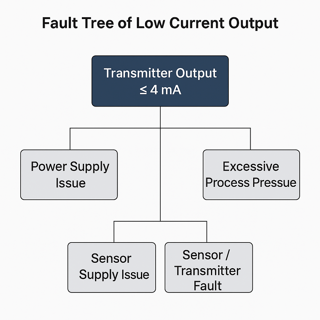 Common Faults of Pressure Transmitters: Eight Categories and 24 Solutions / Pressure Transmitter 1. IntroductionBrief role of pressure transmitters in industrial automation.Importance of fault diagnosis and preventive maintenance. 2. No Output from the TransmitterInspection & Testing (check power polarity, 24VDC supply, display head, loop continuity).Solutions (correct wiring, ensure ≥12V supply, replace faulty display, check loop impedance ≤250Ω). 3. Transmitter Output ≥20 mAInspection & Testing (over-range pressure, sensor damage, wiring issues).Solutions (select proper range, repair/replace damaged sensor, tighten wiring). Table 1 — Common Causes of Over-Range Output in Pressure TransmittersCauseDescriptionRecommended SolutionActual Process Pressure Exceeds RangeThe applied process pressure is higher than the transmitter’s selected span.Select a transmitter with a higher range or adjust span setting.Sensor Overload / Diaphragm DamageSevere overpressure may damage the sensing diaphragm permanently.Return to manufacturer for repair or replace damaged sensor.Power Supply AbnormalitySupply voltage too low or unstable, causing incorrect loop current.Ensure supply ≥12 VDC at the transmitter terminals; check loop impedance.Loose or Incorrect WiringLoose terminal screws or wrong polarity connections.Reconnect wires securely with correct polarity.Electrical Load Too HighLoop resistance beyond transmitter’s capability.Reduce loop load or increase supply voltage (must remain <36 VDC).External Interference / NoiseEMI or transient spikes may push output to maximum.Apply shielding, grounding, and separate signal cables from power cables. 4. Transmitter Output ≤4 mAInspection & Testing (low power supply, sensor damage, wrong range selection).Solutions (adjust load, re-select transmitter, factory repair if sensor damaged). 5. Incorrect Pressure IndicationInspection & Testing (reference instrument accuracy, mismatched ranges, wiring correctness, grounding, cable routing, sensor health, process conditions).Solutions (use accurate reference, adjust load resistance, add cooling/condensate pot, clean impurities). 6. Installation IssuesCases with saturated steam, superheated steam, and external steam supply.Problems due to improper condensate pot height, short impulse lines, static pressure differences. 7. Impulse Line BlockageCauses: impurities, corrosion, dust deposition.Symptoms: pressure reading unchanged, only little water drains from vent.Solutions: regular flushing, filtration at pressure ports. 8. Transmitter Hardware FailureExample: lube oil pressure transmitter triggering shutdown due to sudden internal failure.Long-term drift and sensitivity degradation.Solutions: regular calibration, replacement of aged sensors. 9. Electromagnetic Interference (EMI)Cases: compressed air discharge pressure signals fluctuating near high-voltage rooms.Solutions: cable shielding, grounding, separating signal and power cables. 10. Preventive Measures & Maintenance GuidelinesUse filters to avoid impulse line blockage.Install condensate pots correctly for steam measurement.Separate signal and power cabling to minimize EMI.Conduct periodic calibration and verification.Replace or repair sensors after long-term operation. 11. ConclusionPressure transmitters are robust but prone to multiple fault categories.Proper diagnosis, structured troubleshooting, and preventive maintenance significantly extend their lifecycle. Share This Story, Choose Your Platform! Contact Us Please prove you are human by selecting the house. Request a Quote