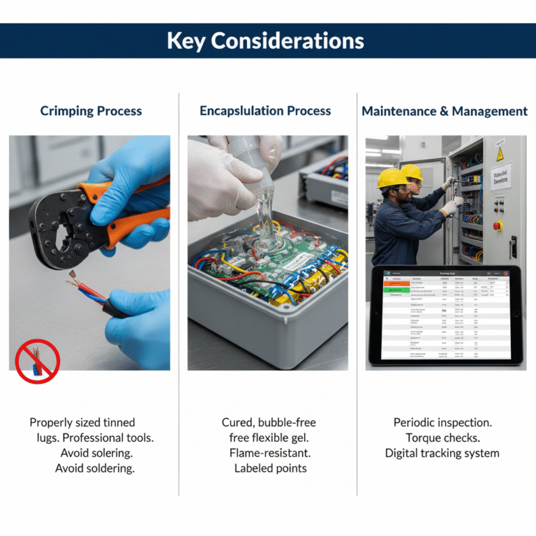Requirements: Never use tin-plating on multi-strand copper wires, as soldered joints lack elasticity and are prone to fatigue and breakage under vibration. Use appropriately sized tinned copper lugs and professional crimping tools to ensure secure connections with low contact resistance.
