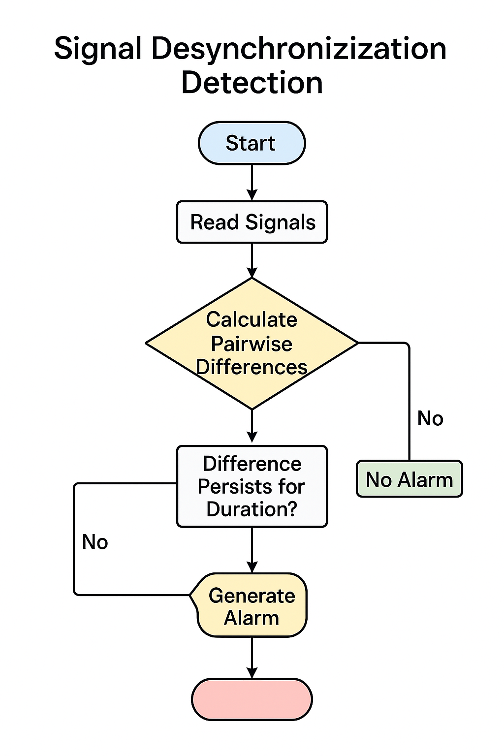 However, signal desynchronization between these redundant channels can lead to incorrect logic decisions, false alarms, or delayed system responses. Causes range from sensor response time differences to sampling delays and electromagnetic interference (EMI). Therefore, designing an effective desynchronization alarm logic is crucial to detect such anomalies promptly and accurately.