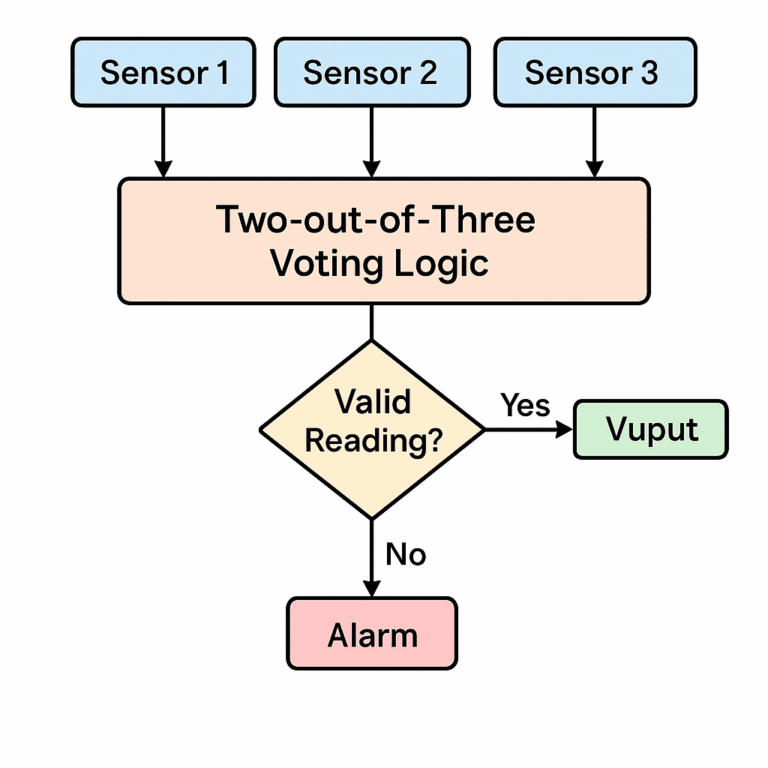 For critical measurement parameters—such as temperature, pressure, and liquid level—two-out-of-three voting logic (2oo3) is commonly used. This architecture employs three independent sensors measuring the same variable and determines the valid reading when at least two sensors agree, ensuring continuity and fault tolerance.