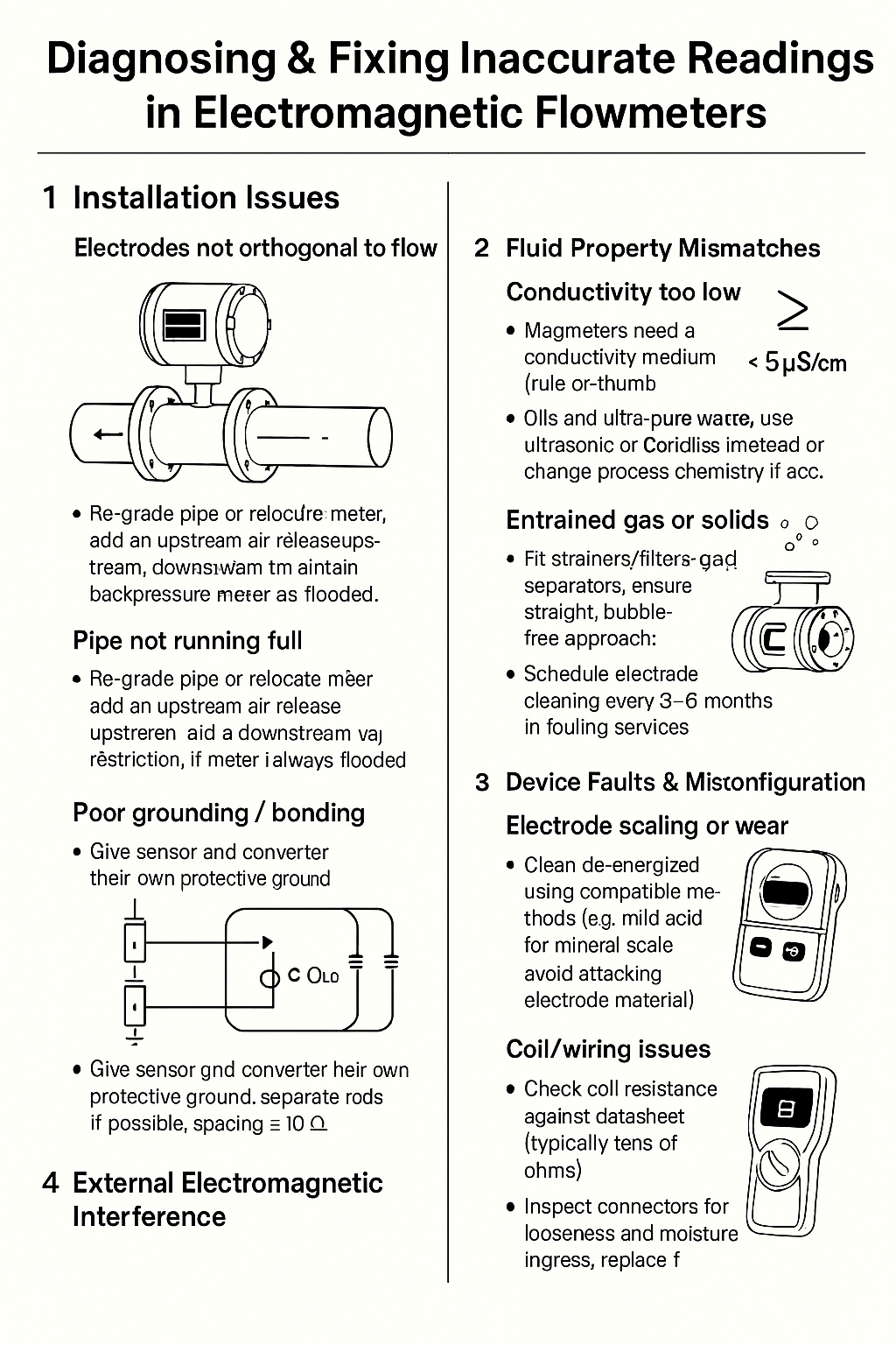 Most accuracy problems come down to four buckets: installation, fluid properties, device faults, and external interference. Use the triage table below, then follow the corrective actions.