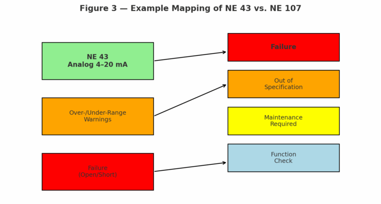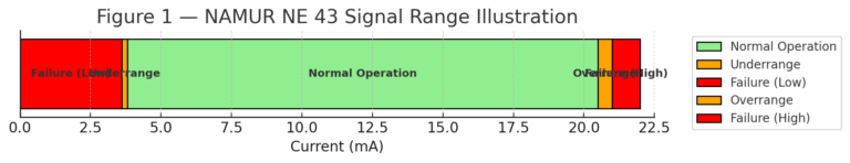 NE 43 standardizes analog signal behavior (4–20 mA) to indicate failure conditions.