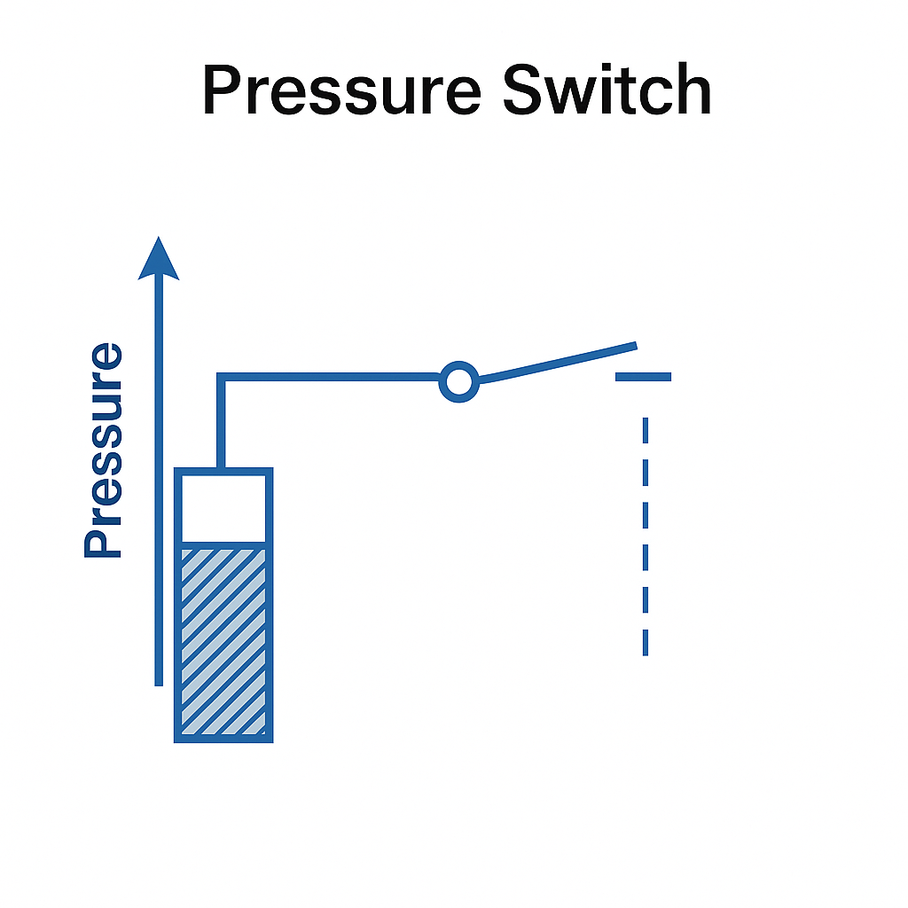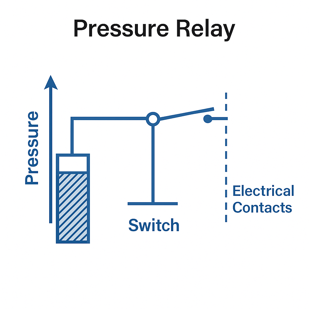 Pressure Relay | Switch signal (multiple contacts possible) | Sequential / interlock control | Hydraulic/pneumatic systems, safety protection | More outputs and complex logic |