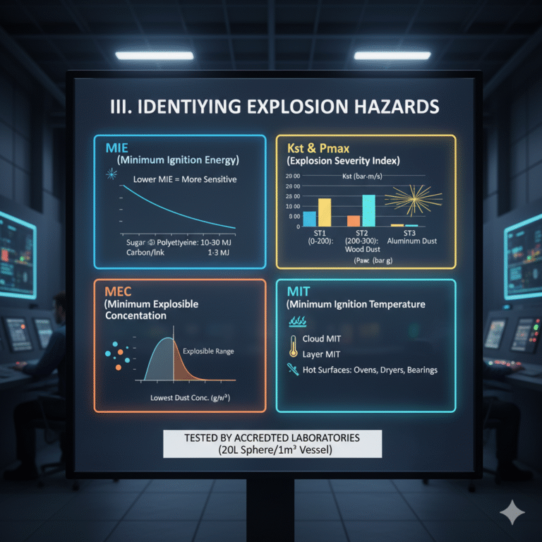 Measured in millijoules (mJ), the lower the value, the more sensitive the material is. For example, sugar powder has an MIE of around 30 mJ, polyethylene powder ranges from 10-30 mJ, and some carbon or ink powders can go as low as 1-3 mJ.Kst & Pmax (Explosion Severity Index):