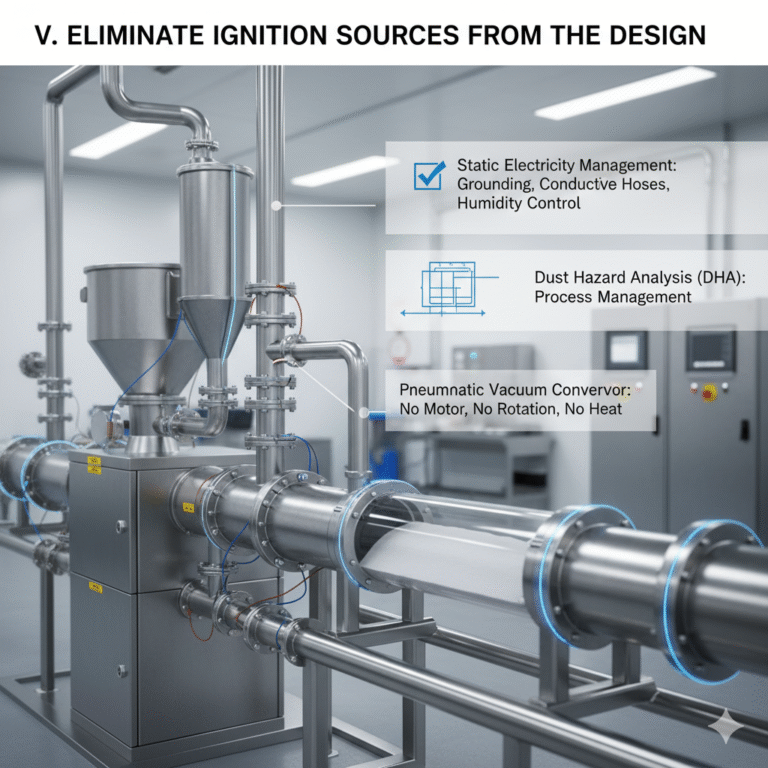 Take Volkmann’s pneumatic vacuum conveyor as an example: The system uses compressed air to drive multiple ejector vacuum pumps, creating negative pressure without motors, rotating parts, or significant heat sources. The entire system is designed to be conductive and certified for ATEX Zone 1/2/21/22. This type of sealed, dust-tight conveying system reduces dust leakage and secondary risks.Note: The equipment itself does not generate heat or electricity, but external utilities (e.g., compressed air) may still require electrical input. This reflects a proper understanding of “no electricity, no heat, no rotation.”