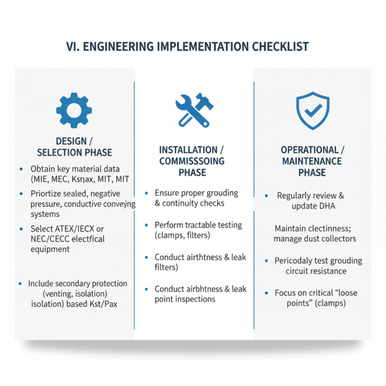 Select electrical equipment according to ATEX/IECEx or NEC/CEC zoning (Zone or Class/Div), while meeting static electricity control requirements.