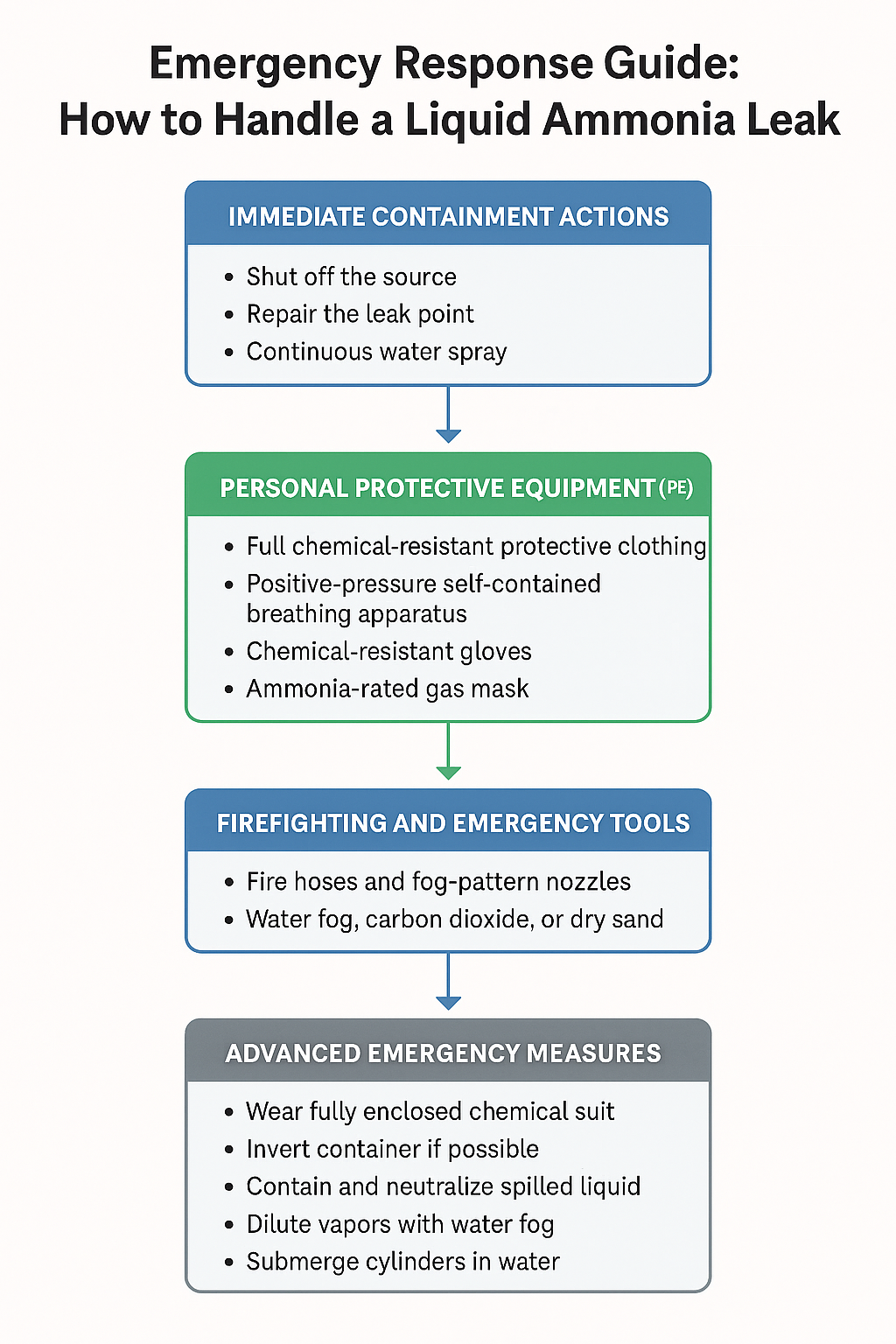 This guide outlines practical measures for safely managing a liquid ammonia leak — from immediate containment to personal protection and environmental precautions.