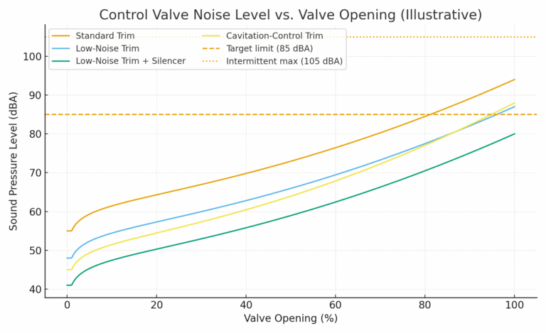 Engineering controls such as low-noise trim, silencers, and insulation should be considered to meet occupational safety standards.