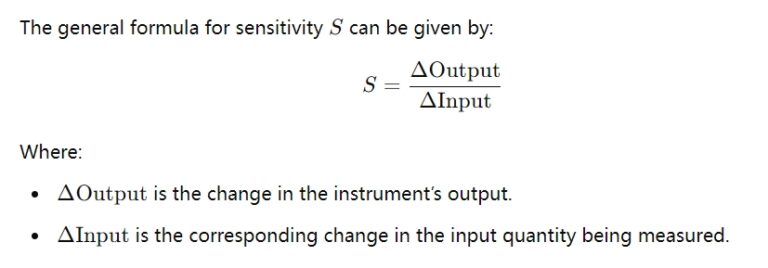 - Sensitivity is about the instrument’s responsiveness to changes in the measured quantity. High sensitivity means the instrument reacts more to small changes in input.