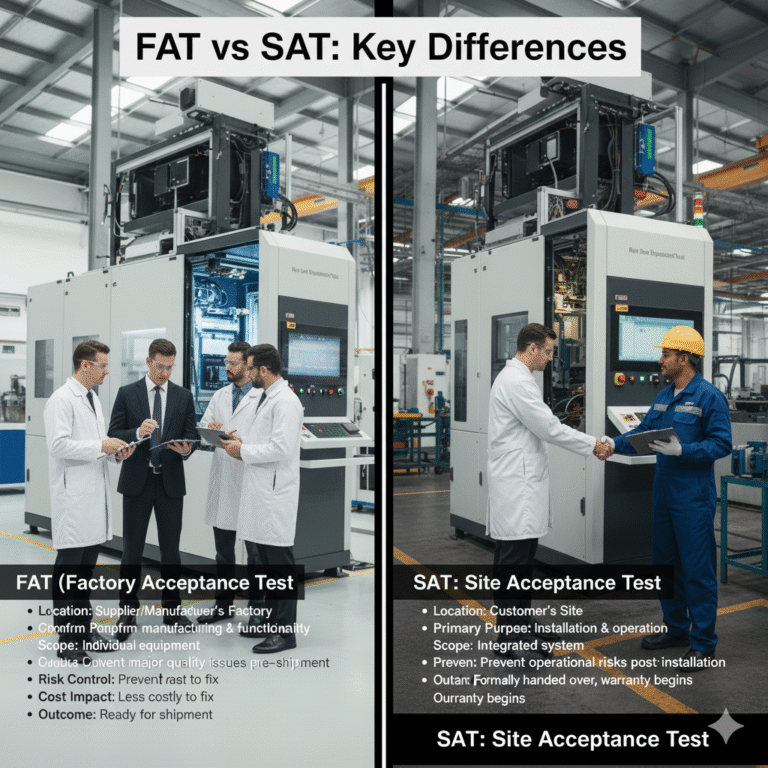 Cost ImpactIssues found during FAT are generally less costly to fix.Issues found during SAT are more costly (involve disassembly, downtime).