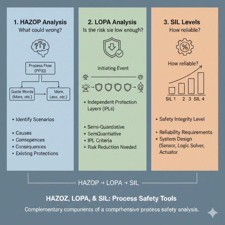 In process safety, three tools are frequently mentioned together and often confused: HAZOP, LOPA, and SIL. By putting them into a logical sequence, we can clarify their roles: