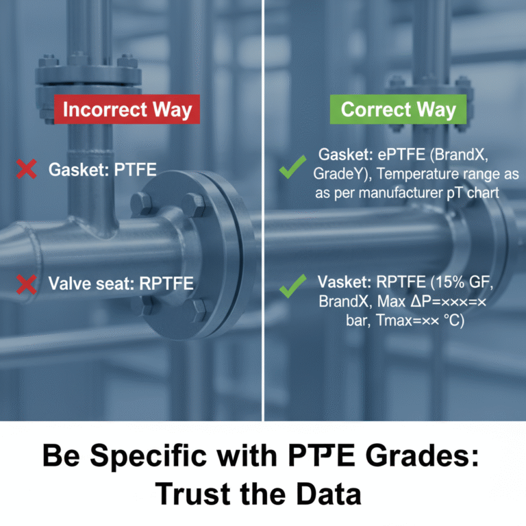 “Valve seat: RPTFE (15% GF, BrandX, Max ΔP=×× bar, Tmax=×× °C)”