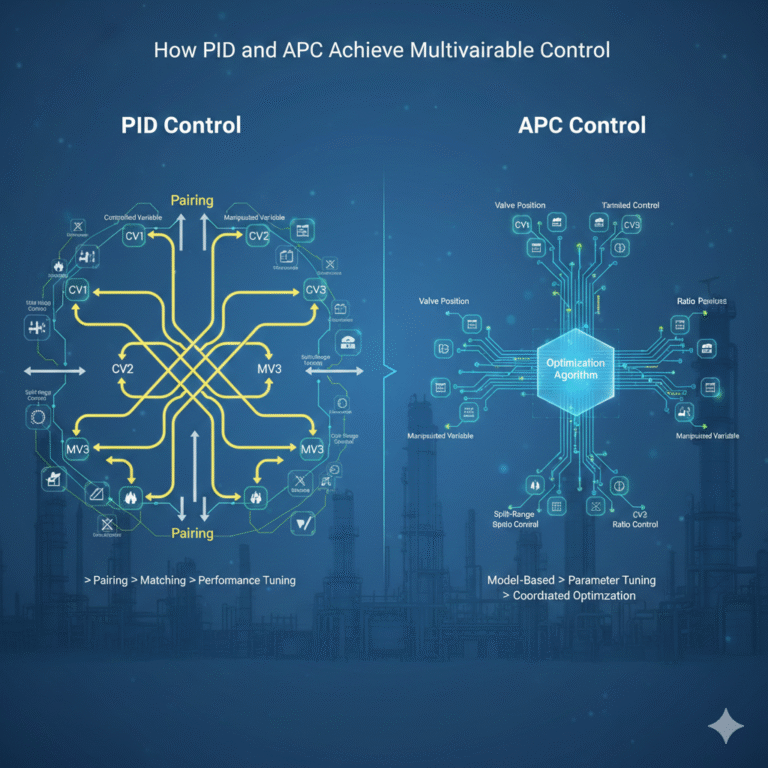 While PID can theoretically handle multivariable control, the complexity makes it difficult to widely adopt. APC, on the other hand, provides a simpler solution by using models and parameters to achieve multivariable control. Unlike PID, APC excels in multivariable coordination and optimization.