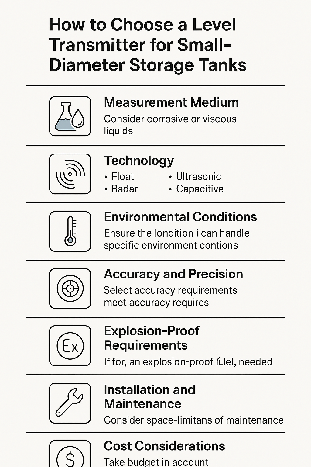 Choosing the right level transmitter for small-diameter storage tanks involves evaluating various factors such as the type of liquid, environmental conditions, accuracy needs, and cost.