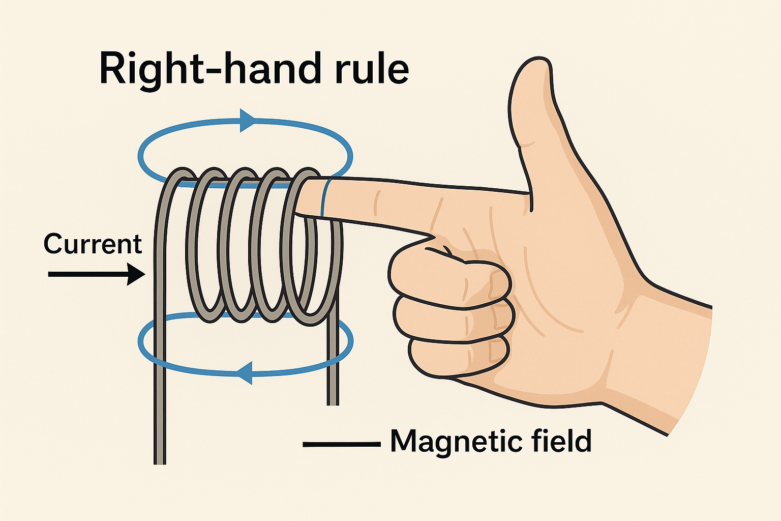 Right-hand rule for coils: Curl the fingers of your right hand in the direction of conduction path around the coil; your thumb points along the coil’s axial magnetic field (the “north” side).