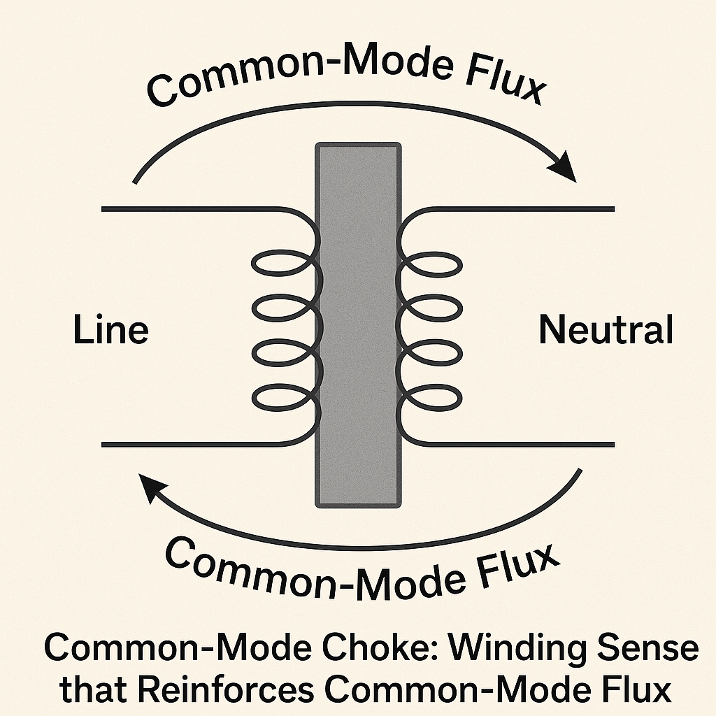 Common-mode chokes: two windings on a shared core, wound so that line and neutral common-mode currents produce reinforcing flux (high impedance). Differential currents largely cancel.