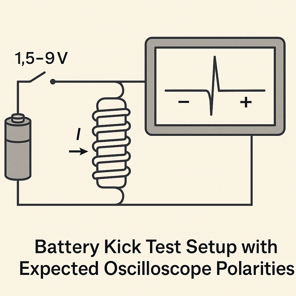 Battery “kick” + oscilloscope: momentarily connect a 1.5–9 V source through a switch to the primary; watch induced pulse polarity on the secondary. The first pulse sign reveals the dot end.