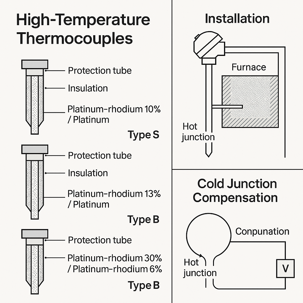 • Sensing elements and protection tubes must use refractory materials (e.g., alumina, platinum-rhodium alloys) to ensure long-term stability at 1200 °C without degradation.