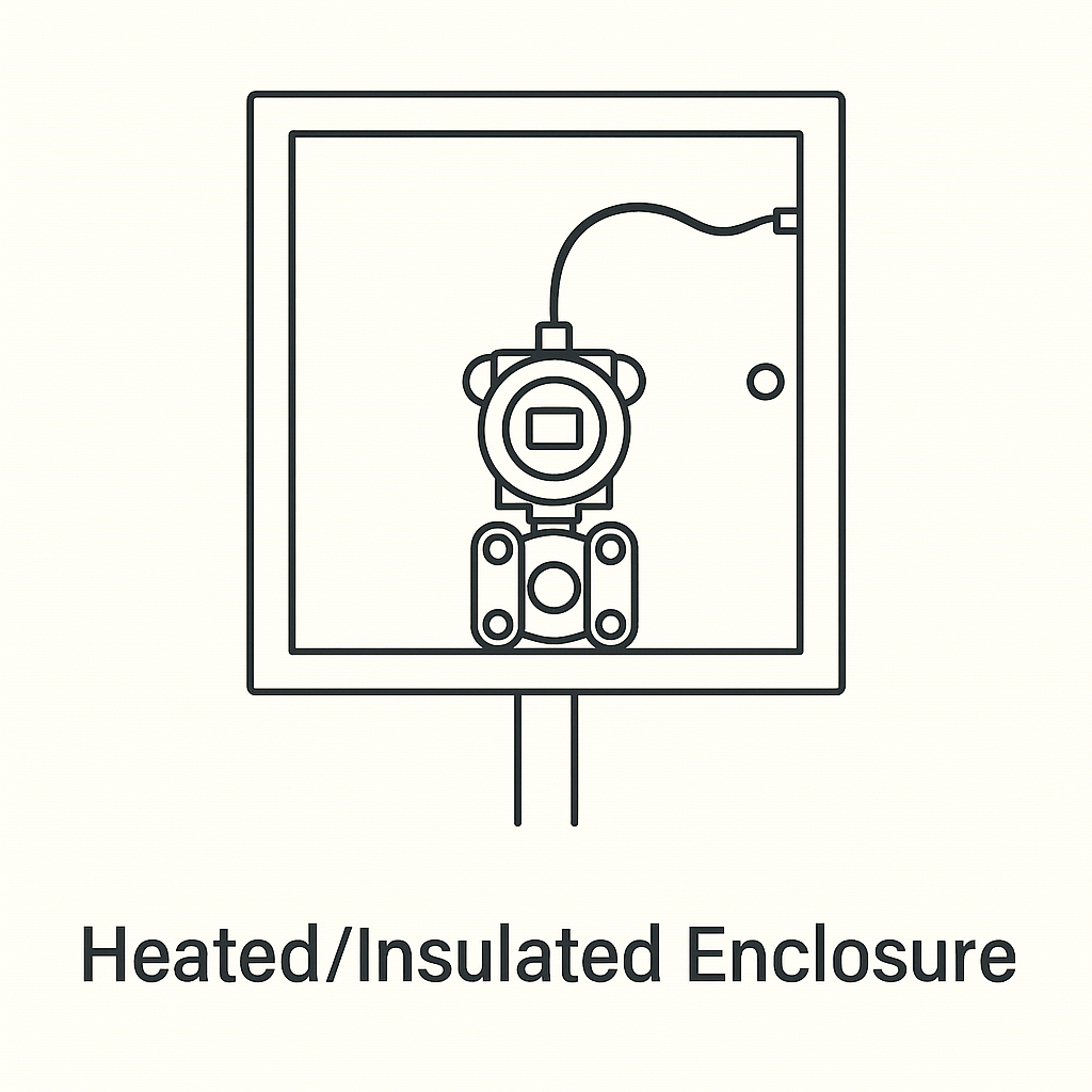 Weather protection: For outdoor installs, use a heated/insulated instrument enclosure so the electronics and LCD operate within rated temperature and ingress protection.