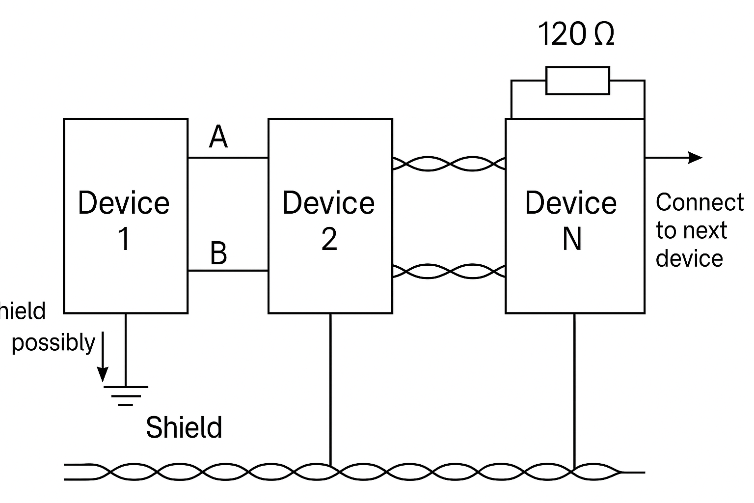 A 120 Ω resistor at both ends of the bus absorbs signal energy, preventing reflection — much like installing dampers in a pipeline to stop water hammer.Receiver Input Impedance (in Multi-Drop Networks)