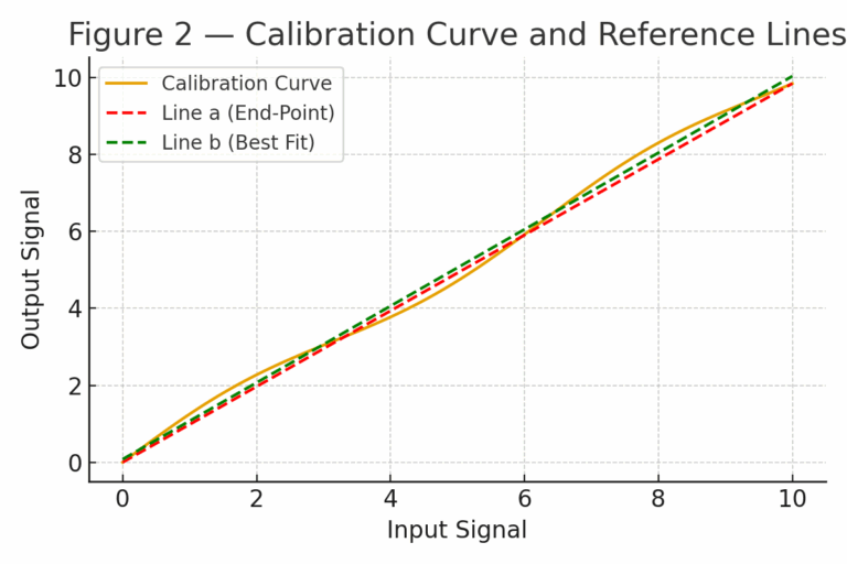 When evaluating an instrument’s calibration curve, nonlinearity error is measured as the maximum deviation between the curve and a reference straight line. Two common reference lines exist: