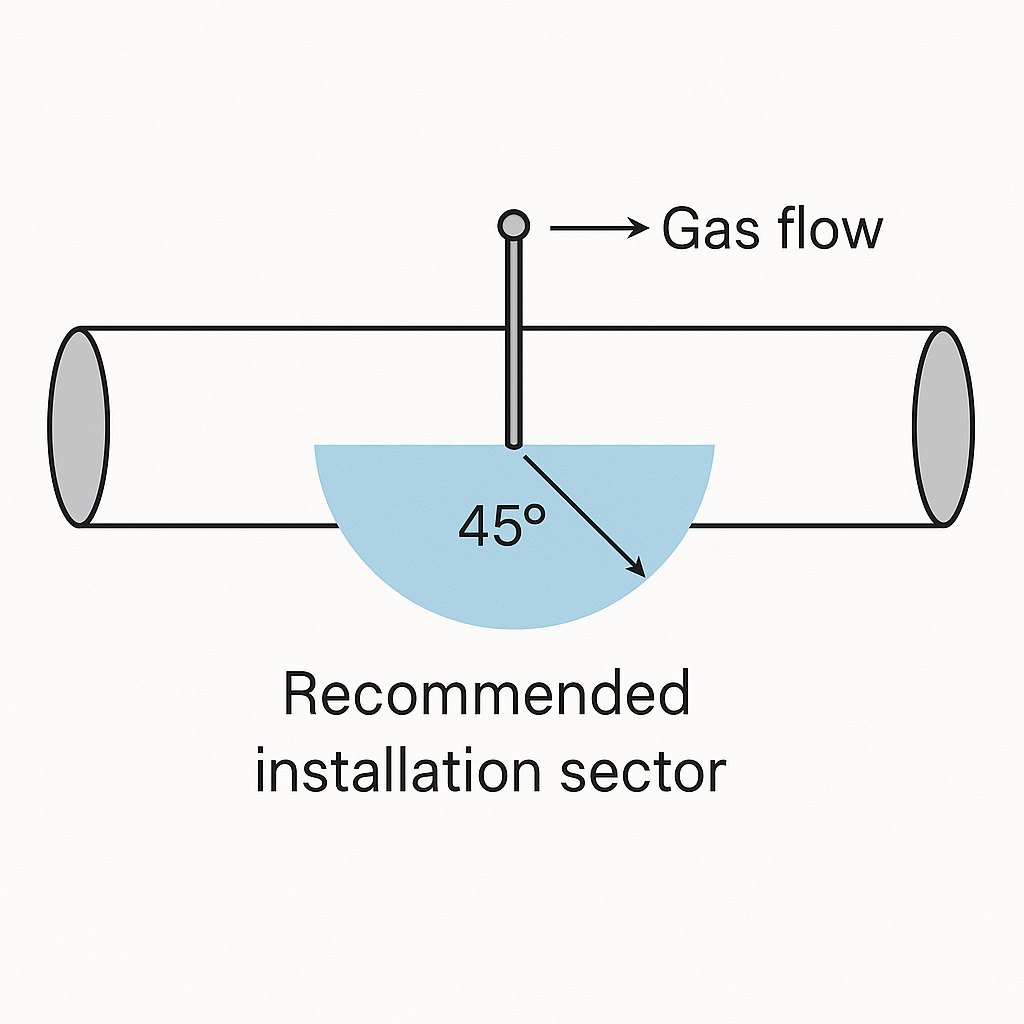 • Horizontal pipelines: Install probe at the upper-side 45° region to avoid droplet impingement and bottom liquid accumulation.