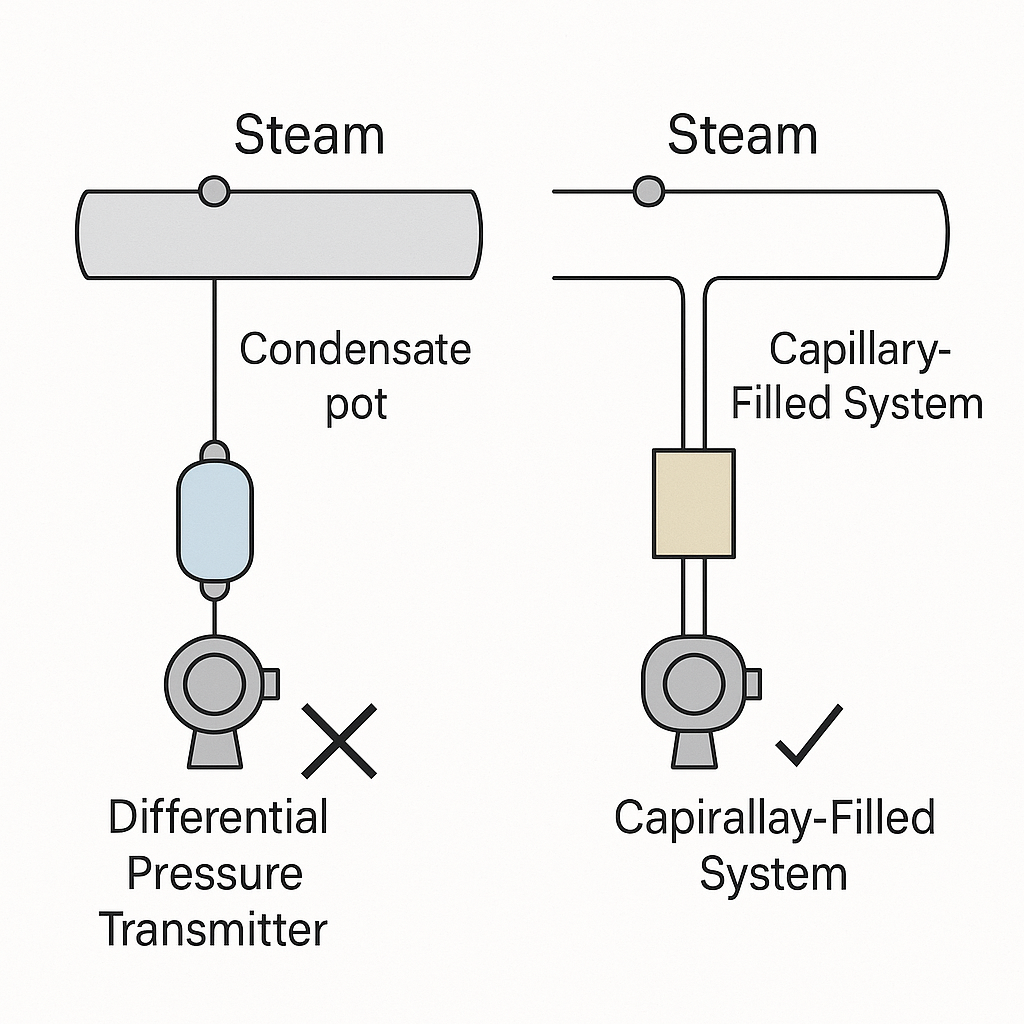 • Density mismatch: Water column density is hundreds of times higher than steam; using condensate distorts the signal.