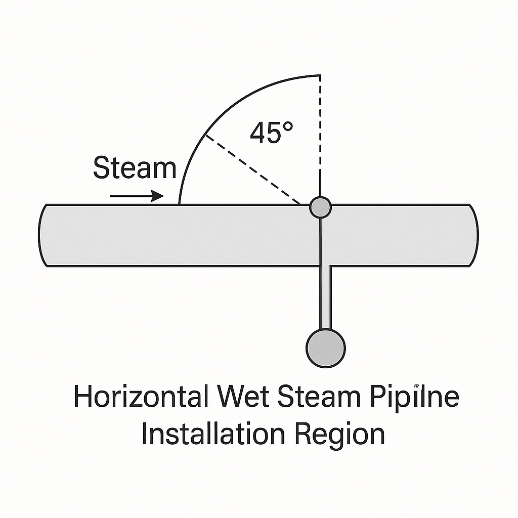 Horizontal pipelines: Install probe at the upper-side 45° region to avoid droplet impingement and bottom liquid accumulation.