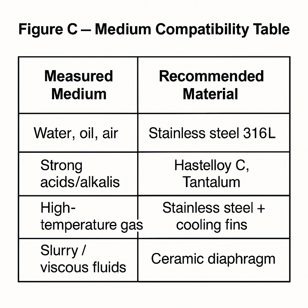 The wetted parts of a pressure sensor (diaphragm, housing, process connection) must be compatible with the measured medium. Selecting the wrong material can cause corrosion, leaks, or sensor failure.