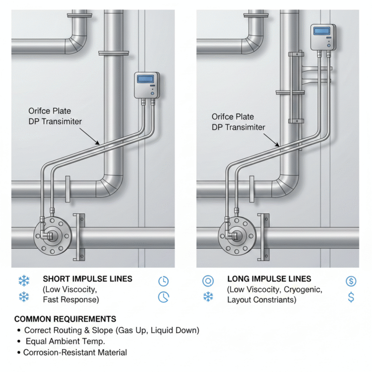 To transmit this pressure difference to the transmitter, two impulse (tapping) lines are installed between the process piping and the DP transmitter.