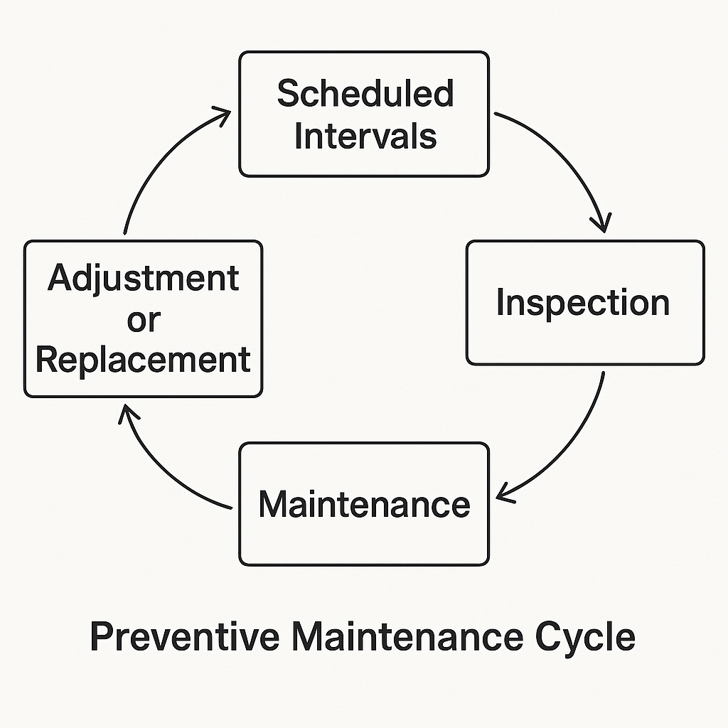 Preventive Maintenance is a time-based or usage-based strategy. Maintenance tasks—such as inspections, lubrication, adjustments, and part replacements—are performed at scheduled intervals (e.g., after a fixed number of operating hours, cycles, or mileage).