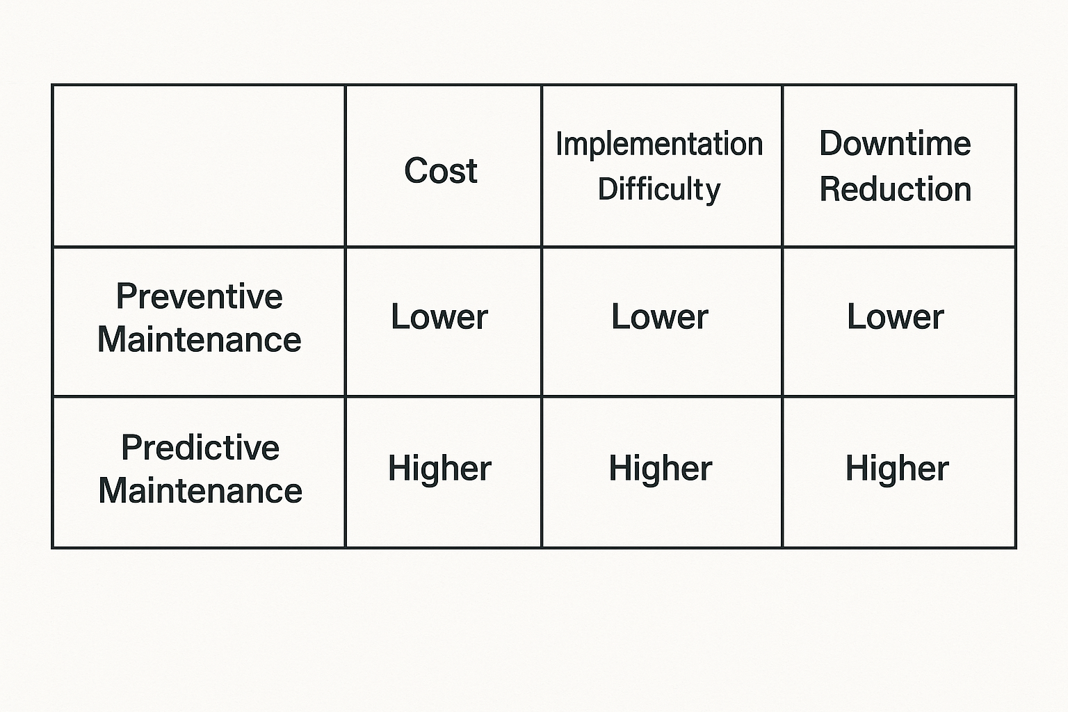 High predictability: Maintenance schedules are easy to plan, allowing resource allocation for manpower, spare parts, and training.