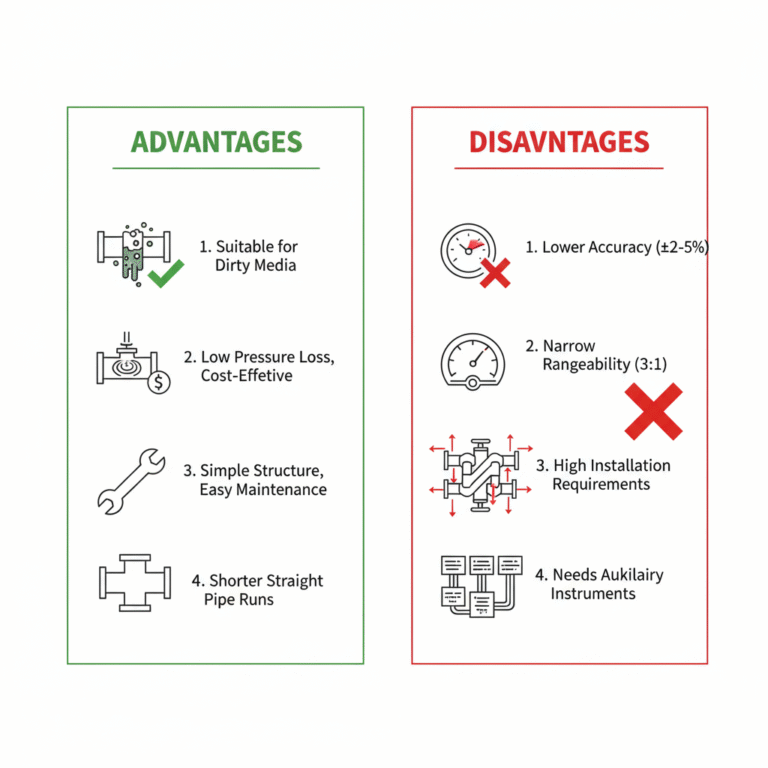 Narrow Rangeability: Since the pressure difference is proportional to the square of the flow rate, the differential pressure signal is small at low flow rates, making it difficult to measure accurately. Therefore, the rangeability (the ratio of maximum flow rate to minimum flow rate) is generally narrow, usually around 3:1.