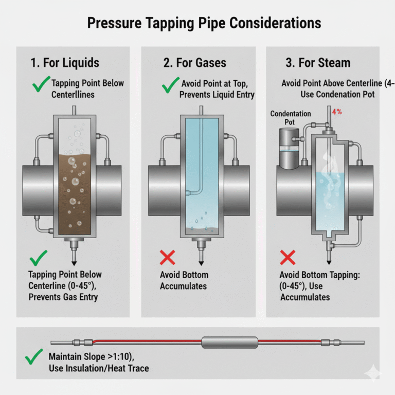 The tapping pipe should be kept as short as possible and maintain a certain slope (typically greater than 1:10) to ensure that gas bubbles (for liquids) or condensate (for gases) can smoothly drain or return.