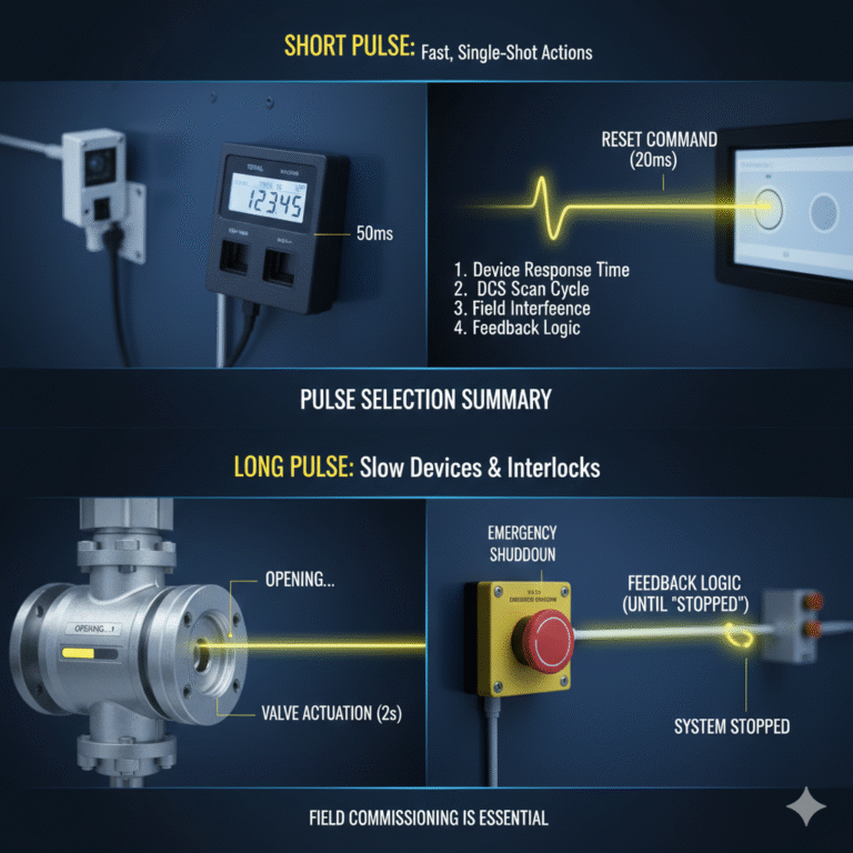 Pulse signals are widely used in Distributed Control Systems (DCS) to trigger one-time actions such as valve actuation, counter increments, reset commands, and interlock releases. Selecting the proper pulse type—short or long—and determining appropriate pulse duration are essential to ensure reliable operation, prevent false triggering, and avoid missed actions.