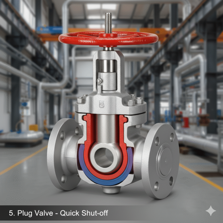 A plug valve uses a cylindrical or conical plug that rotates to align or block the passage of fluid.