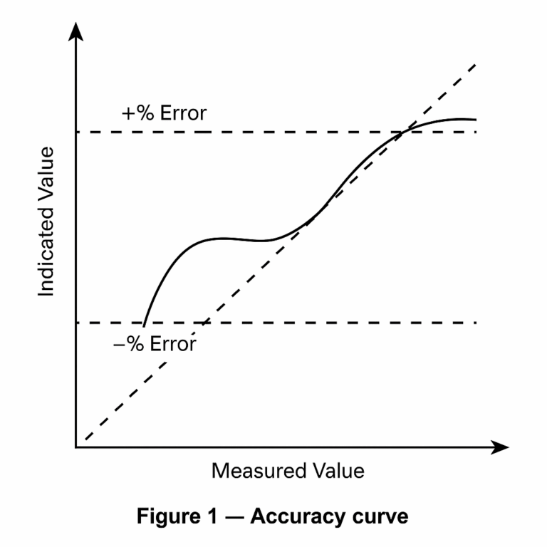 Accuracy refers to the degree of agreement between the instrument’s indication and the true (or agreed) value of the measured variable. It is influenced by systematic error, random error, hysteresis, and dead zone.