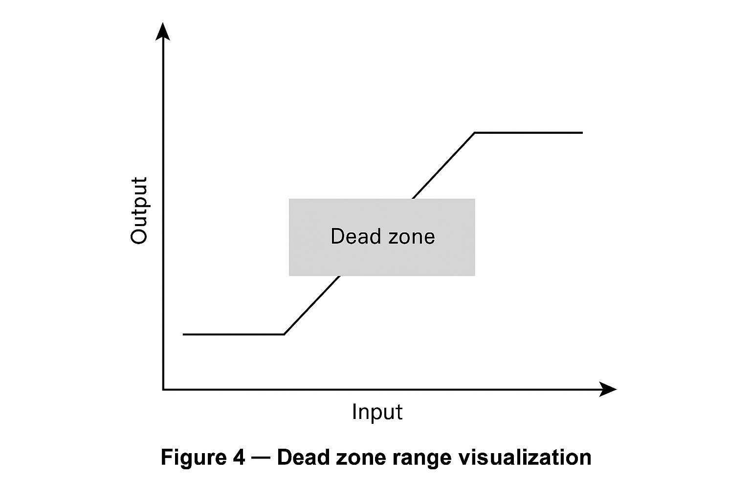 The dead zone is the maximum range of input signal change that does not produce an output response.