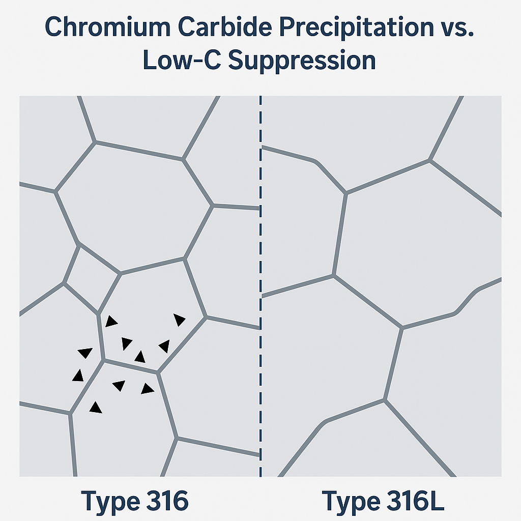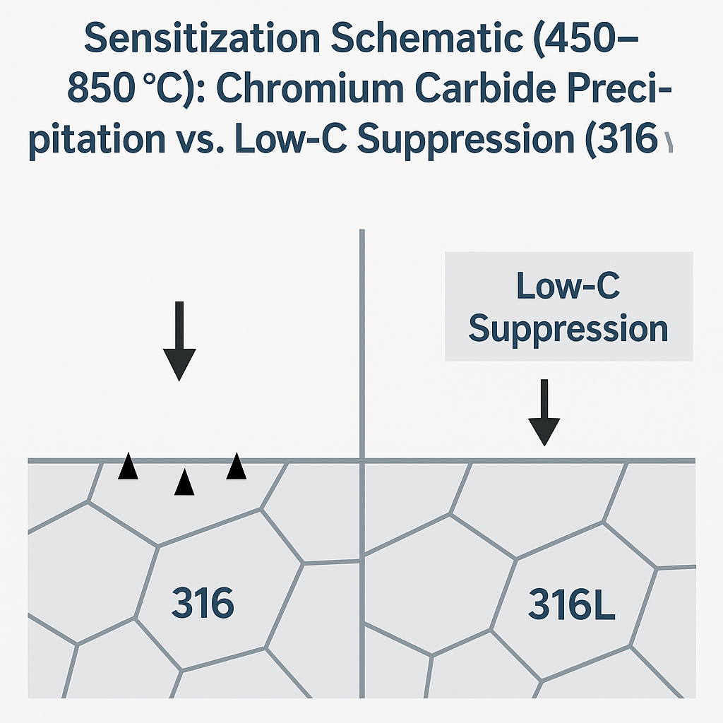 Main metallurgical difference: 316L has lower carbon (≤0.03%) than 316 (≤0.08%), which reduces sensitization during welding and thermal exposure (≈450–850 °C) and helps prevent intergranular corrosion in the heat-affected zone (HAZ).