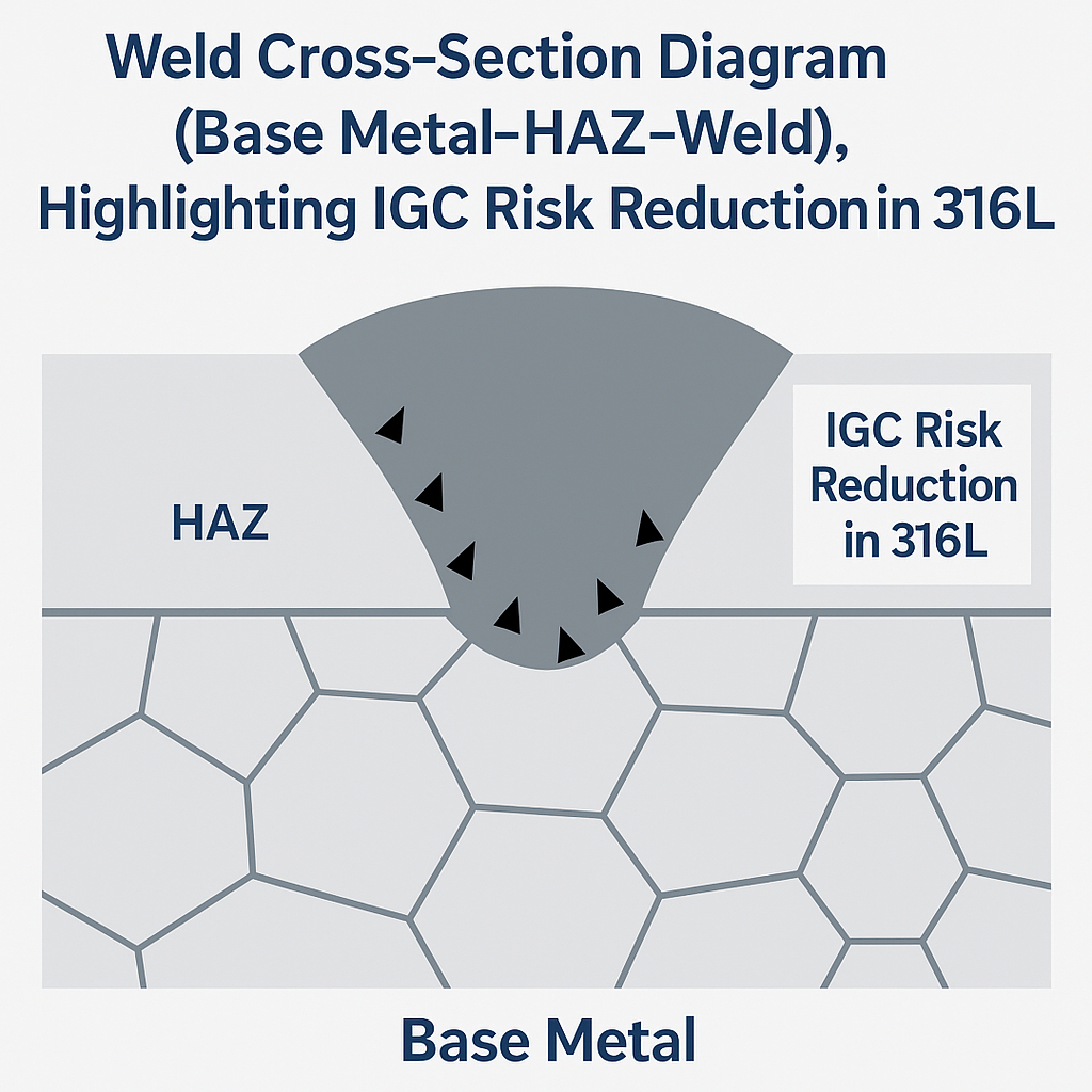 Why low-carbon matters: Lower C in 316L suppresses chromium carbide precipitation in the 450–850 °C range, limiting chromium depletion at grain boundaries. Result: lower sensitization risk and superior HAZ corrosion resistance after welding.