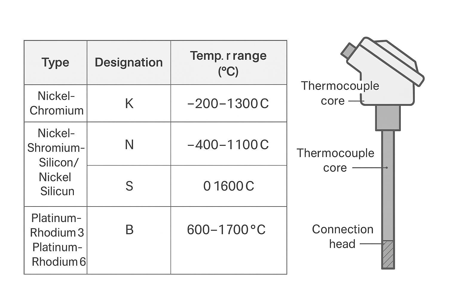 • K/N type: cost-effective, suitable for mid-to-high temperature, accuracy ±1.5~2.5°C.