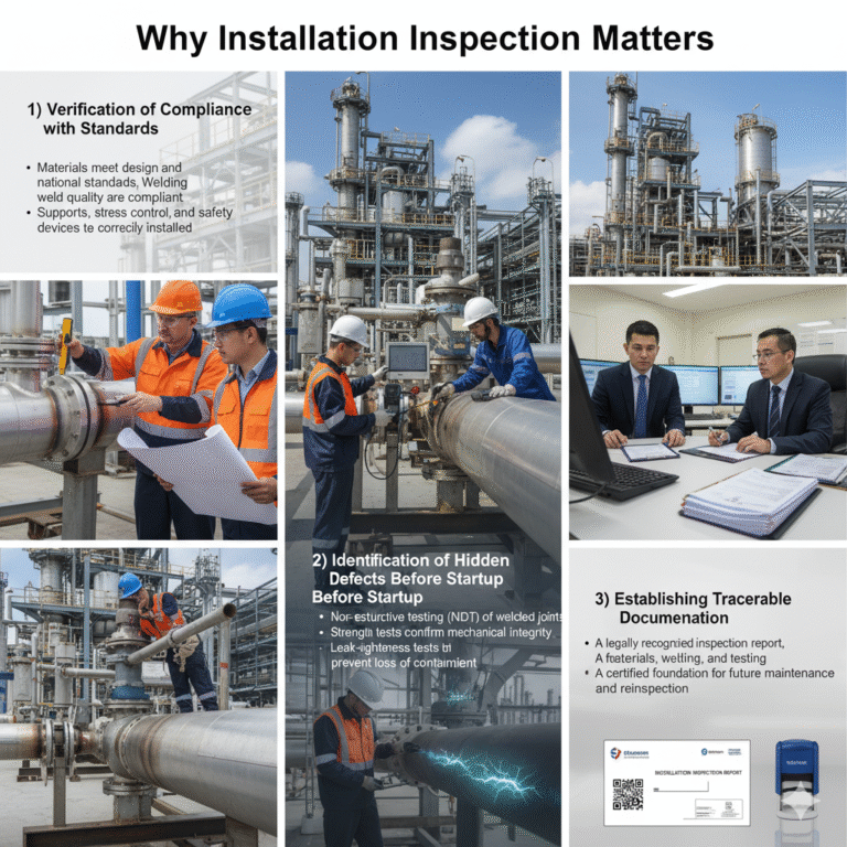 Installation inspection provides three essential guarantees before a system is energized, pressurized, or connected to process media.
