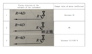 A turbine flowmeter is more sensitive to the influence of the velocity distribution of the inlet fluid. The inlet flow state depends on the piping structure at the inlet of the flow meter. In principle, it is required to have a straight pipe section long enough to eliminate the symmetrical and stable cross-section of the flow velocity of the fluid at the inlet. Figure 1-17 shows the influence of the piping structure at the inlet of the flowmeter on the meter coefficient.