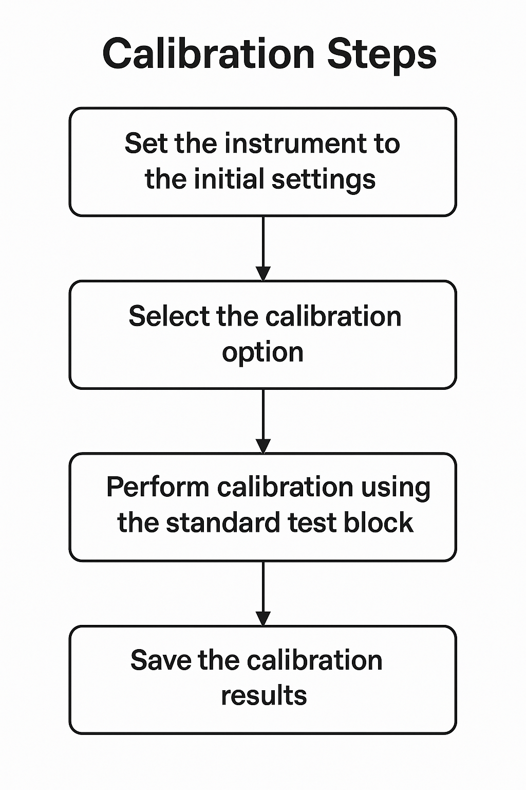 Calibration is performed using reference blocks or standardized test blocks (e.g., IIW blocks), ensuring each parameter meets tolerance limits.